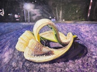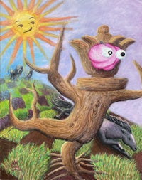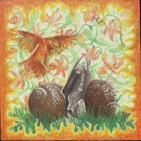 Watercolor, colored pencil, and carving on cold press grounds on found wood panel